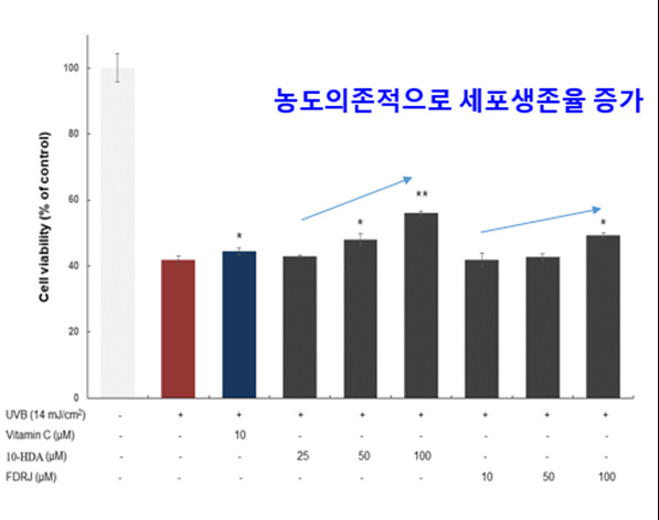 ▲14mJ/㎠ 세기의 자외선에 노출 ▲동결건조 로열젤리 처리 시 세포 생존율 증가 확인 ▲농도 높을수록 세포 생존율 증가 |