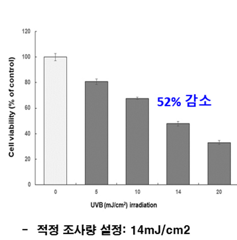 ▲자외선의 세기에 따라 세포 생존율 감소 ▲14mJ/㎠ 세기 때 세포 50% 이상 감소 |