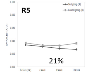 ▲R5(거친 정도 척도) 피부의 평균 거칠기를 의미 ▲대조군(무처리군) 대비 21% 개선 효과 |