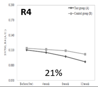 ▲R4(주름 깊이의 평균값 척도) 피부 주름의 평균 깊이를 의미 ▲대조군(무처리군) 대비 21% 개선 효과 |